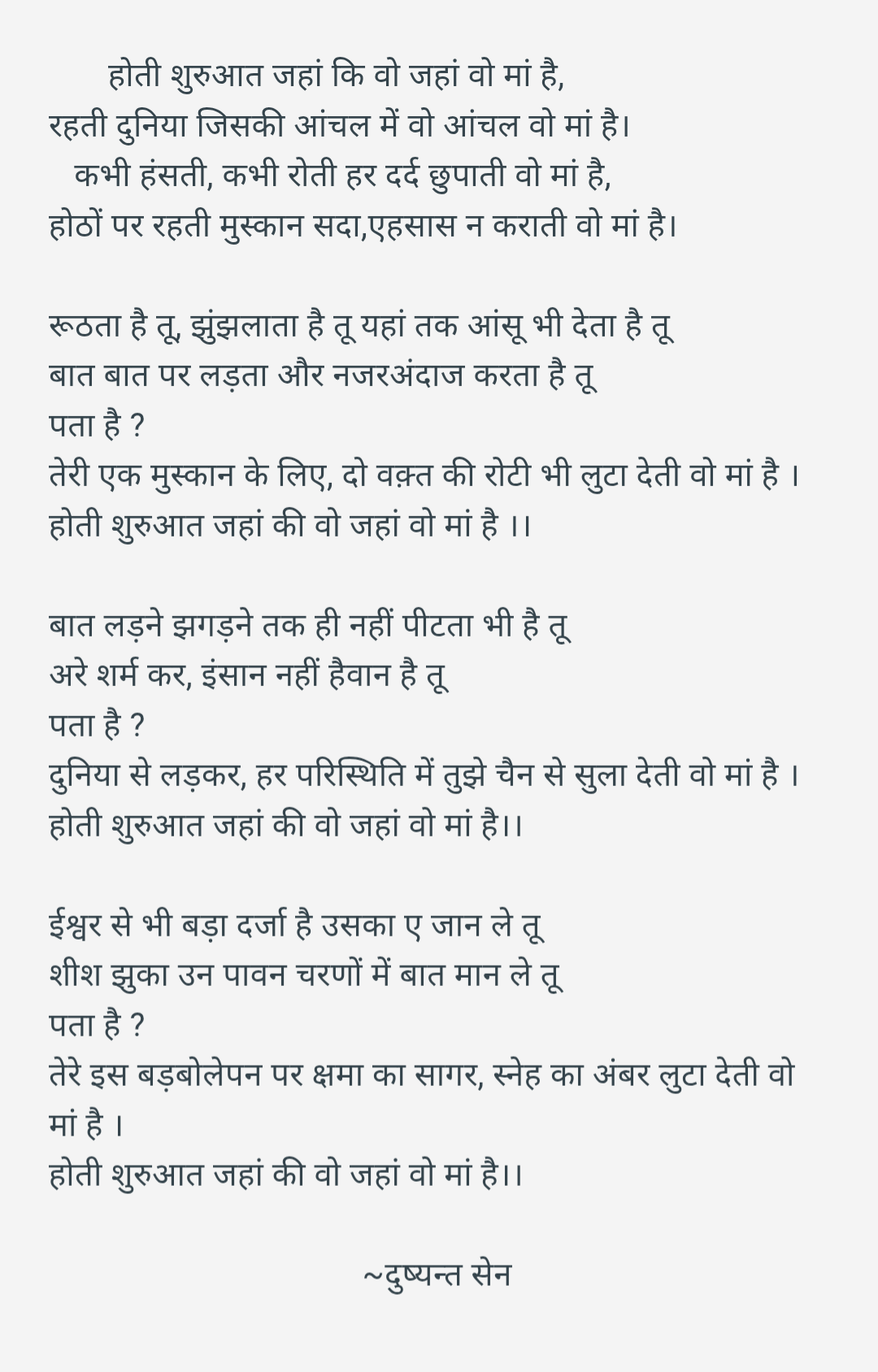 एक दिन स्कूल जाते वक्त मुझे रस्ते में एक मां मिली जो बीच रास्ते में खड़ी नजर लगाए थी कि कोई मुझे हाट तक छोड़ दो शायद सब्जी लेने जा रही थी । मैने गाड़ी रोकी और उस मां को साथ बैठा लिया पूछा कहां जा रही है आप इतनी बुजुर्ग है घर में बेटे या पति नहीं है ? तो बोली कि ४ बेटे हैं, लेकिन वो साथ नहीं रहते खिलाते पिलाते भी नहीं और बाते अलग सुनते है तो मैं उनसे अलग अपनी एक छोटी सी कुटिया में रहती हूं । तो उन्हीं के ऊपर मैने ये कविता लिखी जो बच्चे अपने मां बाप का सहारा बुढ़ापे में छोड़ देते है या साथ नहीं रहते । ये गलत है दुनिया में लाने वाले को ही इंसान भूल जाता है । उनकी ही बदौलत से आप है आप से वो नहीं है । धन्यवाद ।